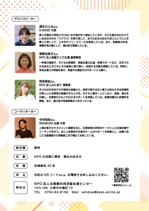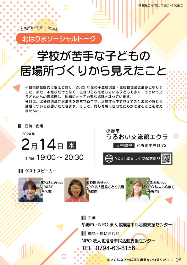 今回は、北播磨地域で居場所を運営する中で見えてきた現状や感じる課題についてお話いただきます。そして、同じ地域に住む私たちができることを考えませんか。