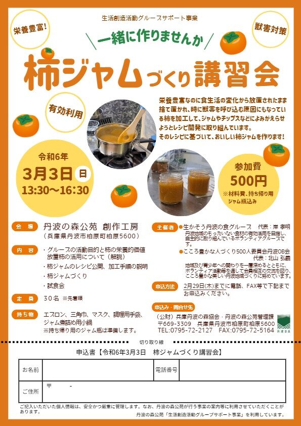 | 申込み・問合せ先 | (公財)兵庫丹波の森協会・丹波の森公苑管理課 〒669-3309 兵庫県丹波市柏原町柏原5600 TEL:0795-72-2127 FAX:0795-72-5164 |
