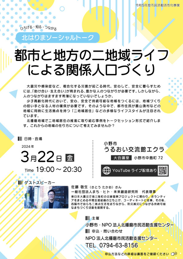 北播磨地域で二地域居住の推進に取り組む事例をトークセッション形式で紹介します。これからの地域の在りかたについて考えてみませんか?