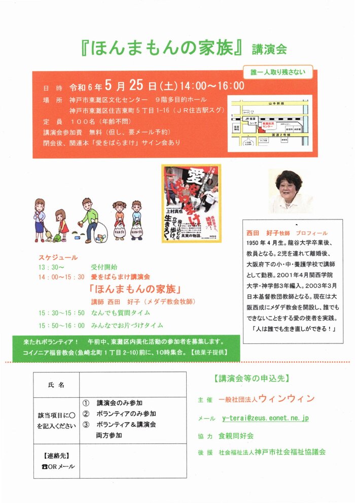 今回協力団体の食親同好会です。昨年4月に設立されました一般社団法人ウィンウィンが初主催の講演会を開催することになりました。ことの発端はNHKのEテレ「こころの時代」とラジオ深夜便「明日へのことば」でメダデ教会西田牧師の肉声を聴かせてもらった縁だそうです。その内容は4ポイント。