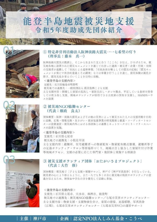 1月に起きた能登半島地震では神戸の市民活動団体も翌日から支援に駆け付け、現在も継続中の団体もあります。