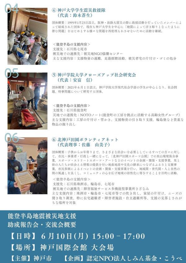 これを受け神戸市は、緊急で被災地支援助成を6団体に行いました。