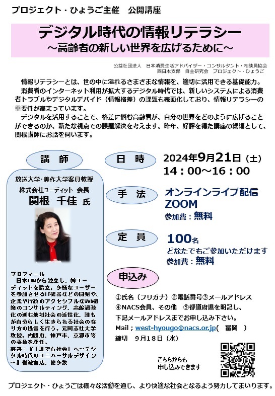 日本最大の消費生活専門家集団であるNACSにおいて、兵庫県の消費者問題を研究し、情報発信を行っているのがプロジェクト・ひょうごです。3年前より「高齢者のデジタル・デバイド(情報格差)」について研究する中で、専門講師による公開講座を実施しています。