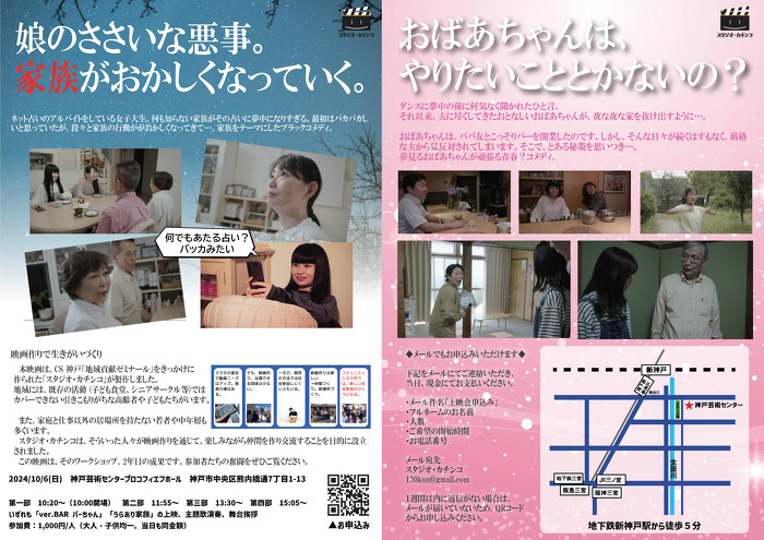 演技初心者を対象に「映画づくりで生きがいづくり」を合言葉に活動するコミュニティシネマ制作ワークショップの一環として作られた短編映画「ver.BAR バーちゃん」と「うらあり家族」の上映会を開きます。
