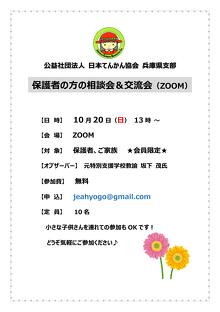 ◆保護者の方の相談会&交流会(Zoom)◆ 途中から参加・途中退出ok、ご家族の映りこみok、気軽にご参加ください‼ 【日 時】 10月20日(日) 午後1時開始 【対 象】保護者・ご家族 ★会員限定★ ※ZOOM利用できる方 【オブザーバー】 元特別支援学校教諭 坂下 茂氏 【参加費】 無料 【申 込】 jeahyogo@gmail.com 【定 員】 10名