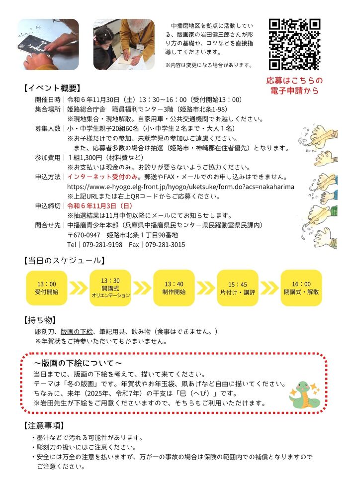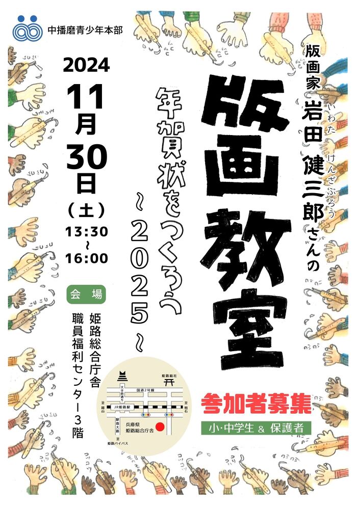 姫路を代表する版画家 岩田健三郎氏を講師に、版画の年賀状作成を行い、子どもたちの創造性、表現力を育みます。