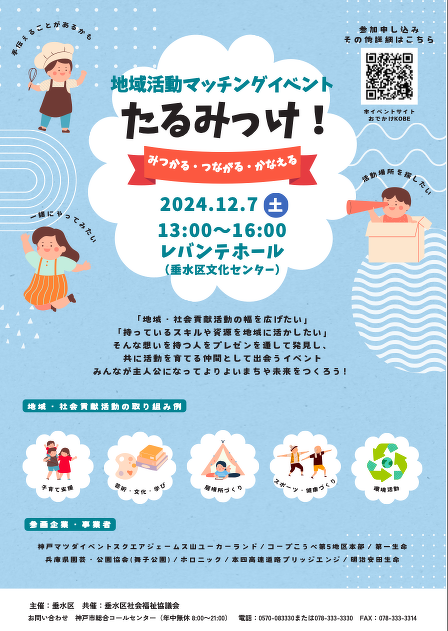 この取り組みの一環として、垂水区では「地域・社会貢献の取り組みの幅を広げたい!」「自身のスキルや場所を地域に活かしたい!」という“想い”を“カタチ”にするため、個人や団体・グループ、企業がつながる地域活動マッチングイベント「たるみっけ!」を開催します。