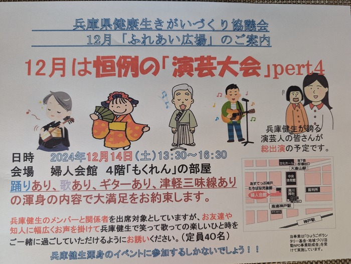 12月14日(土)のふれあい広場につきましては、13時30分から「婦人会館・もくれん」にて、健生メンバーによる大演芸大会の開催を予定しています。出演者はその道のプロではないかといわれている津軽三味線と河内音頭の角木さん・坂口さん渡邊さん、歌と体操の嶋田さん、リズム縄跳びの横山さん、ギター演奏の扶川さん、詩吟の池上さん、腹話術の黒崎さん、ギターと歌での音楽づくりの藤崎さんなどを予定しており、盛り上がり間違いなしのひと時となります。飛び入り参加もあるかな?