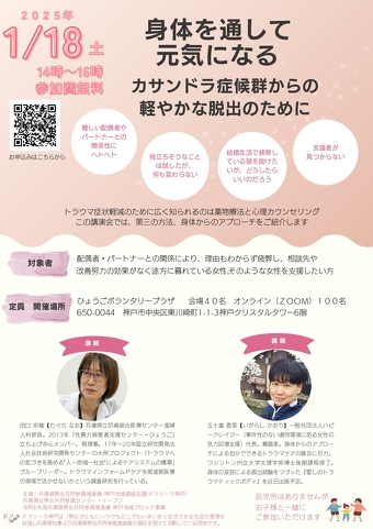 内容:カサンドラ症候群と呼ばれる症状をトラウマ反応ととらえ、身体からのアプローチによるケアで、日常生活がより楽に送れるようになる可能性についてお話しします。