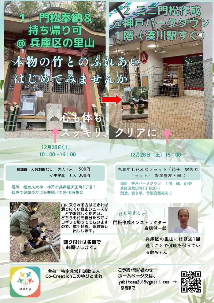 門松を権太夫大神で作成したり、家庭用や店舗用に持ち帰れます。 山に来られる方は軍手持参、できれば滑りにくい 登山シューズなどでお越しください、竹を自分たちでノコギリで切ってもらいます。道具貸し出しします。 飾り付けは、自宅等で別途お願いします。竹のみ 場所 権太夫大神 神戸市兵庫区天王町1丁目1 初めて参加の方は石井橋バス停10時集合 参加費 【大人】500円 【小中学生】300円 小学生未満 無料(ただし、親子参加のみ)