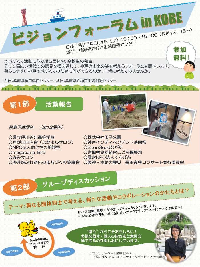 地域づくり活動に取り組む団体や、高校生の発表、そして幅広い世代での意見交換を通して、神戸の未来の姿を考えるフォーラムを開催します。