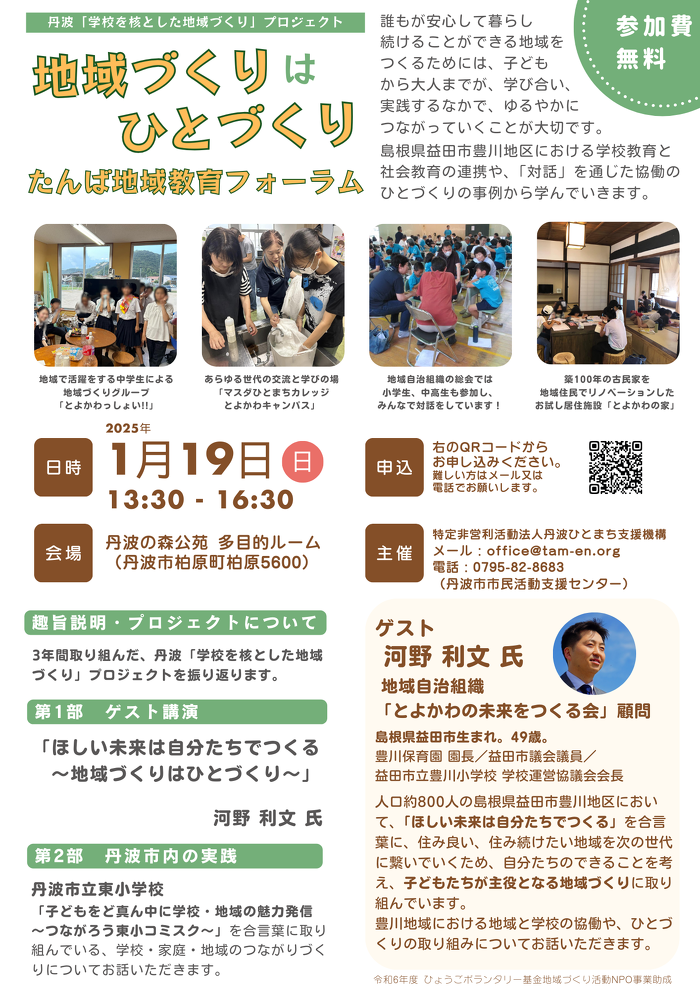 本プロジェクトの最後の企画として、2025年1月19日(日)に「地域づくりはひとづくり」たんば地域教育フォーラムを開催します。