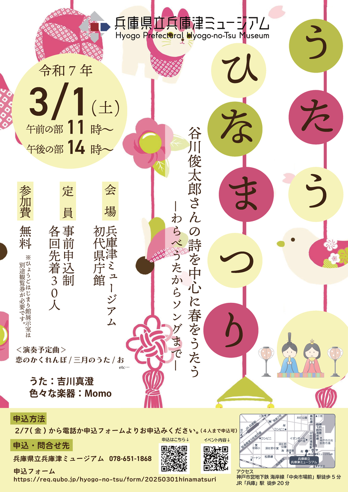 毎年人気のひなまつりコンサートを、今年も兵庫津ミュージアムの初代県庁館、県庁舎内で開催します。今回は詩人の谷川俊太郎さんの詩を中心に春をうたいます。
