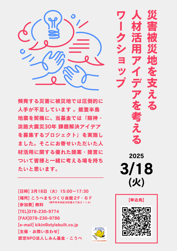 頻発する災害に被災地では圧倒的に人手が不足しています。能登半島地震を契機に、当基金では「阪神・淡路大震災30年 課題解決アイデアを募集するプロジェクト」を実施しました。 そこにお寄せいただいた人材活用に関する優れた提案・提言について、皆様と一緒に考える場を持ちたいと思います。