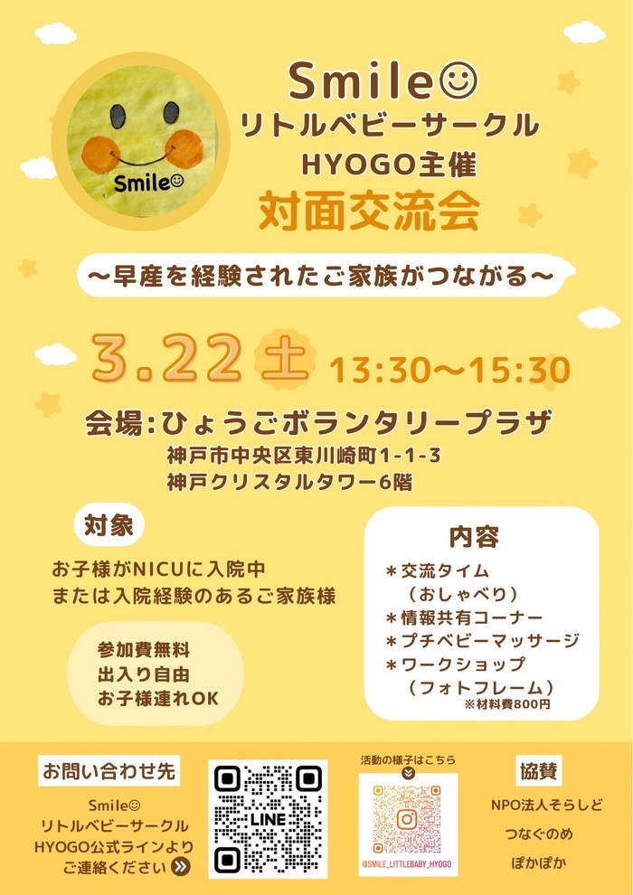Smile☺︎リトルベビーサークルHYOGOさん主催の対面交流会に参加させていただきます。 つなぐのめはリトルベビーのサークルや訪問看護、肌着のお店などの情報コーナーと入院中のお子様に送るフォトフレームのワークショップコーナーを担当させていただきます。 他にもぽかぽかさんによるプチベビーマッサージやおしゃべり会などがあります⭐︎ お近くにお越しの際にはお気軽にお立ち寄りください。