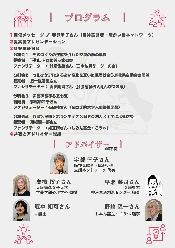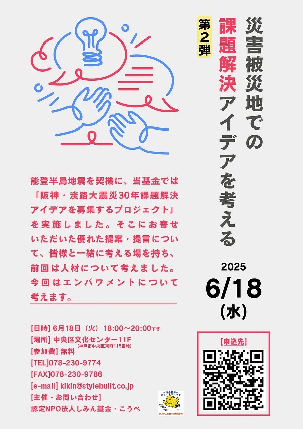 能登半島地震を契機に、当基金では「阪神・淡路大震災30年 課題解決アイデアを募集するプロジェクト」を実施しました。そこにお寄せいただいた優れた提案・提言について、皆様と一緒に考える場を持ち、前回は人材について考えました。今回はエンパワメントについて考えます。