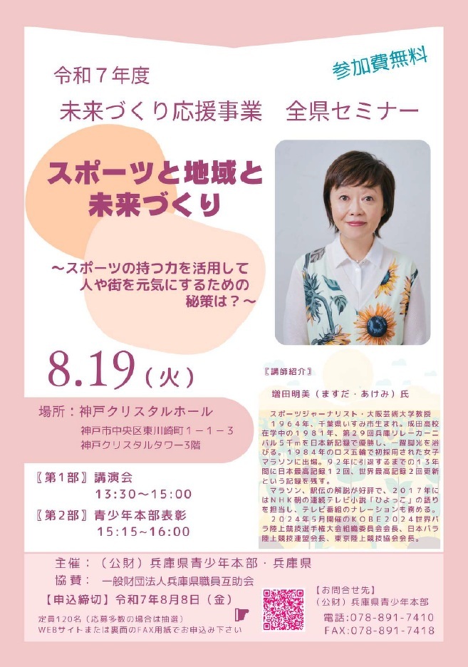 今年度は、昨年神戸で開催された「KOBE2024世界パラ陸上選手権大会組織委員会会長であり、現役時代にはマラソンでオリンピックへの出場や、12回日本最高記録の更新、2回の世界最高記録更新を記録されたスポーツジャーナリストの増田明美さんを講師に迎えます。若者の指導・育成経験豊富な増田さんに、スポーツの持つ力を生かして人や街を元気にする秘訣についてご講演頂きますので、皆様のご参加をお待ちいたしております。