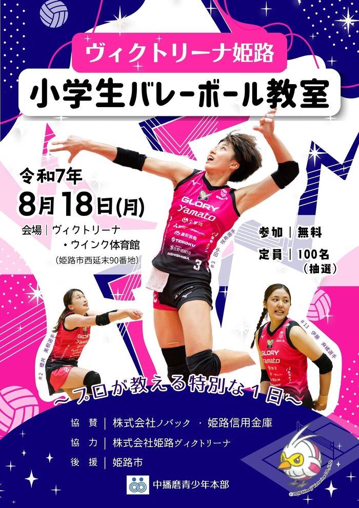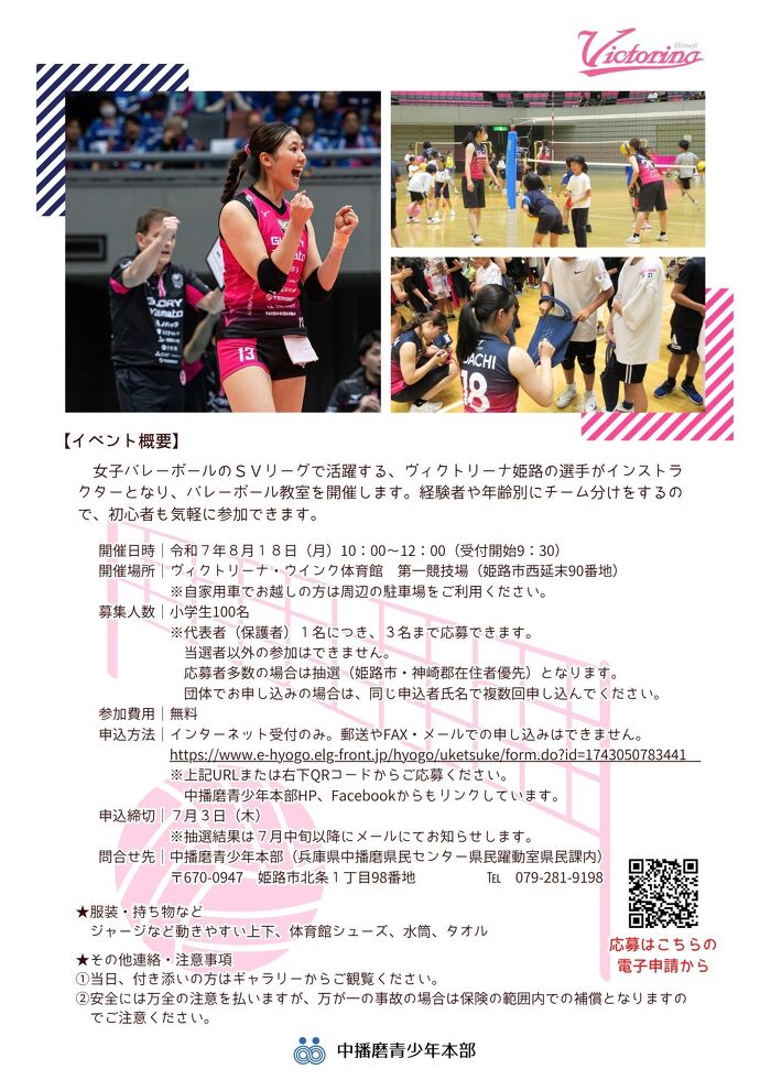 中播磨青少年本部では、スポーツを通じた子どもたちの健全育成を目的に、初心者、経験者を問わず小学生を対象にした地元のSVリーグチームであるヴィクトリーナ姫路の選手によるバレーボール教室を開催します。
