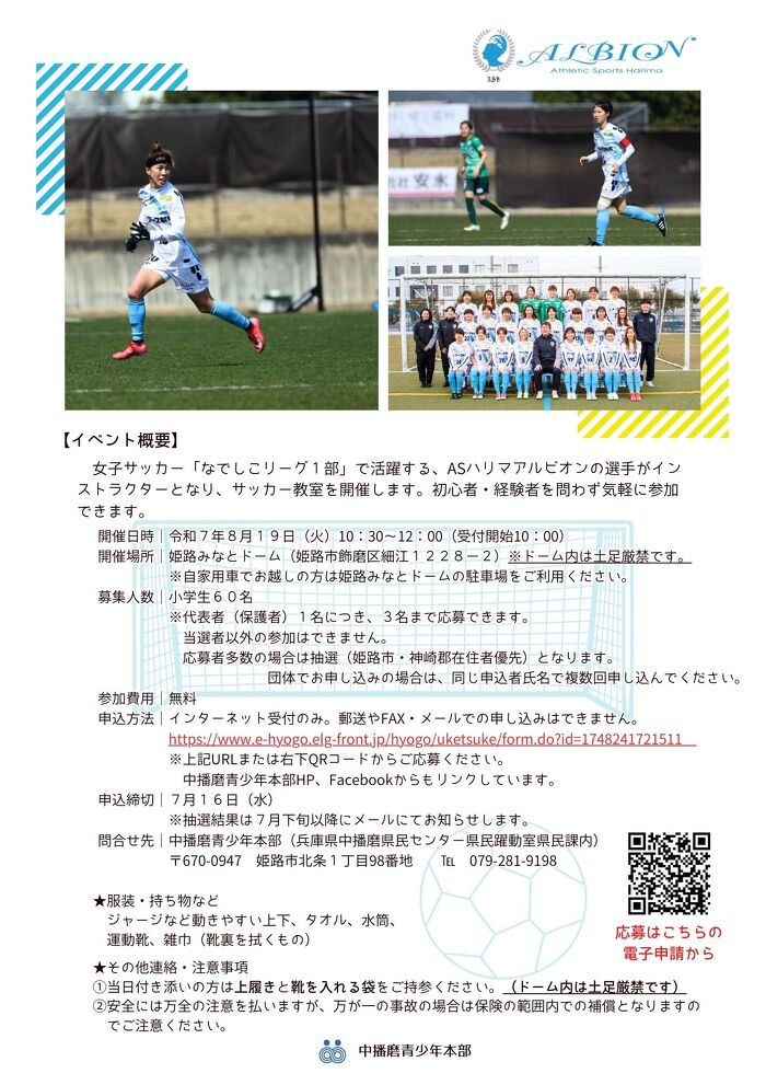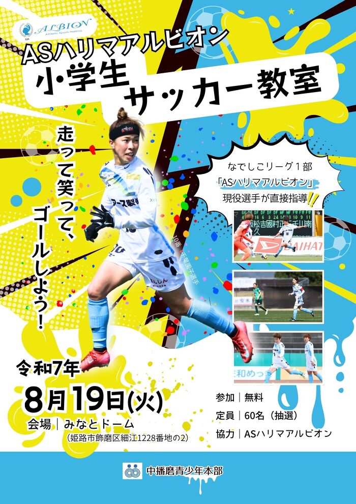 スポーツを通じた子どもたちの健全育成及び地域の未来をつくる青少年を支える人材の確保・育成を図ることを目的に、日本女子サッカー(なでしこリーグ)1部で活躍する、ASハリマアルビオンの選手やコーチの指導のもと、サッカー教室を開催します。