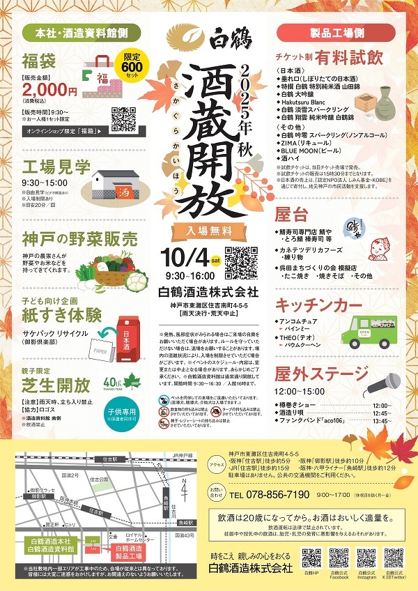 白鶴酒造株式会社は、今年も2025年10月4日(土)に「白鶴2025年秋『酒蔵開放』」を開催します。 このイベントでの有料試飲の日本酒の売り上げは当基金へご寄付いただきます。ご寄付は当基金を通じて市民活動への支援に活用されます。 また、呉田まちづくりの会さんの模擬店、御影倶楽部さんの紙すき体験もあります。 多くの方にお越しいただき楽しく体験して、食べて、試飲をいただければ有難いです!