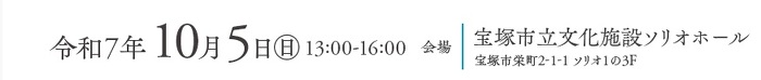 〇令和7年10月5日(日)13:00~16:00/宝塚市立文化施設ソリオホール(宝塚市栄町2-1-1 ソリオ1の3F)