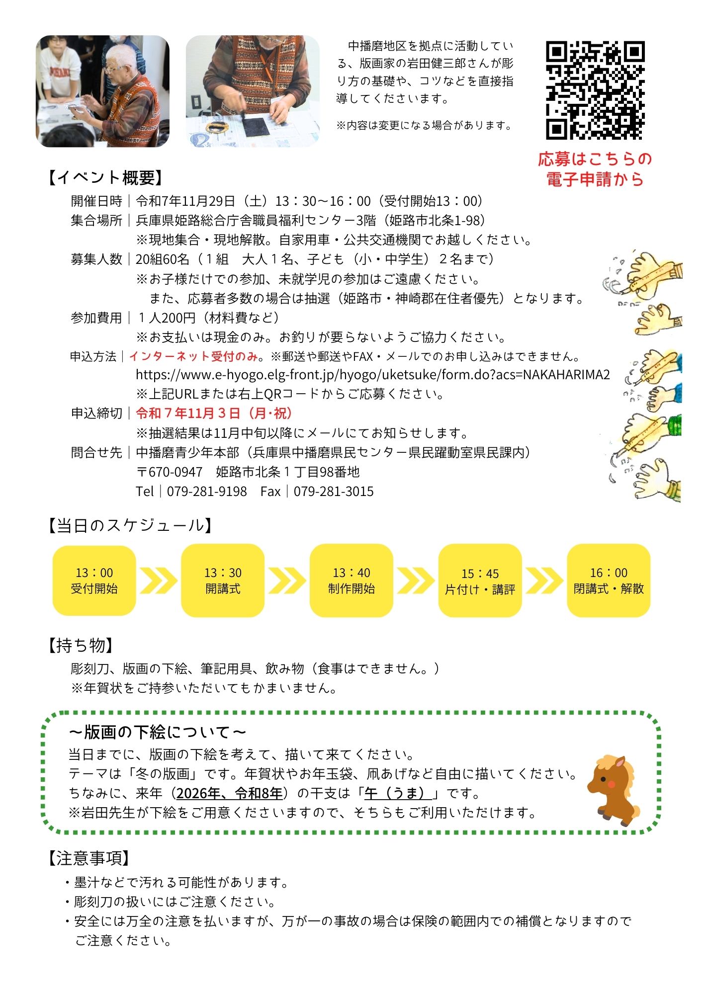 中播磨青少年本部では、行政や民間との協働により多様な青少年健全育成活動を推進しています。姫路を代表する版画家 岩田健三郎氏を講師に、版画の年賀状作成を行い、子どもたちの創造性、表現力を育みます。