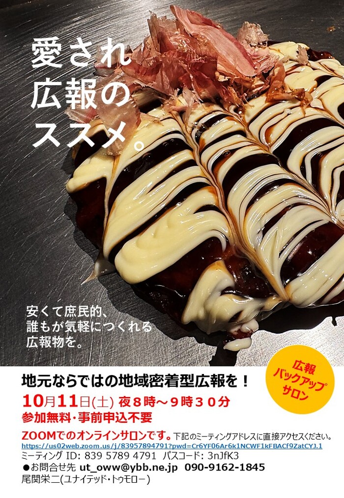 安くて誰からも愛されるB級グルメのような広報物のつくり方、教えます。 10月11日(土) 夜8時~9時30分参加無料・事前申込不要 ZOOMでのオンラインサロンです。下記のミーティングアドレスに直接アクセスください。 https://us02web.zoom.us/j/83957894791?pwd=Cr6YF06Ar6k1NCWF1kFBACf9ZatCYJ.1 ミーティング ID: 839 5789 4791 パスコード: 3nJfK3