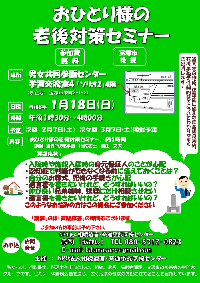 会場:男女共同参画センター学習交流室「ソリオ2」4階 宝塚市栄町2-1-2 日時:令和8年1月18日(日)13:30より 内容:おひとり様の老後対策セミナー 講演約1時間 講師:当NPO理事 行政書士 赤司 勝 質疑応答 お申込み: 赤司(あかし)TEL 080-5312-0823