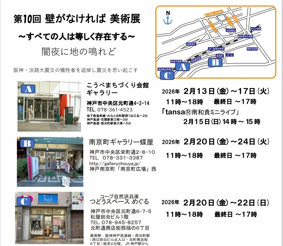 今年度10周年の「壁がなければ」展では、活動当初よりテーマとして持っていた環境との調和にも及べるように皆の心に刻まれている阪神淡路大震災を取り上げ、多数の方に、ご出展戴きます。