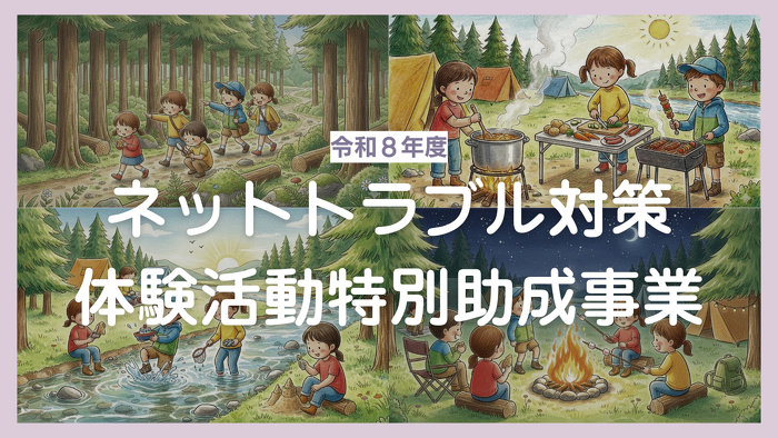 ◎事業内容 日常生活でネット利用を見直したい県内在住の青少年を対象に、ネット依存対策を組み込んだ1泊以上のキャンプ等自然体験活動を含む事業であること