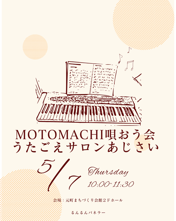 歌声喫茶のような雰囲気でキーボードの生演奏に合わせて、皆様一緒に歌いましょう♬ お近くの方はぜひお越し下さい。季節の童謡、唱歌と歌謡曲を歌います。 日時:2026年5月7日(木)10:00~11:30 場所:神戸まちづくり会館’(元町商店街内) 費用:参加費500円(歌集・飲み物付き)