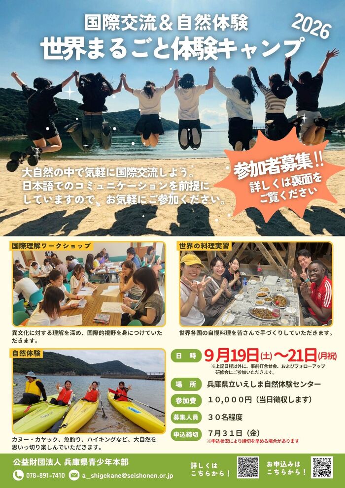 兵庫県青少年本部では、国際性豊かな人材の育成を目的として、兵庫県立いえしま自然体験センターにて「世界まるごと体験キャンプ」を今年も開催します。