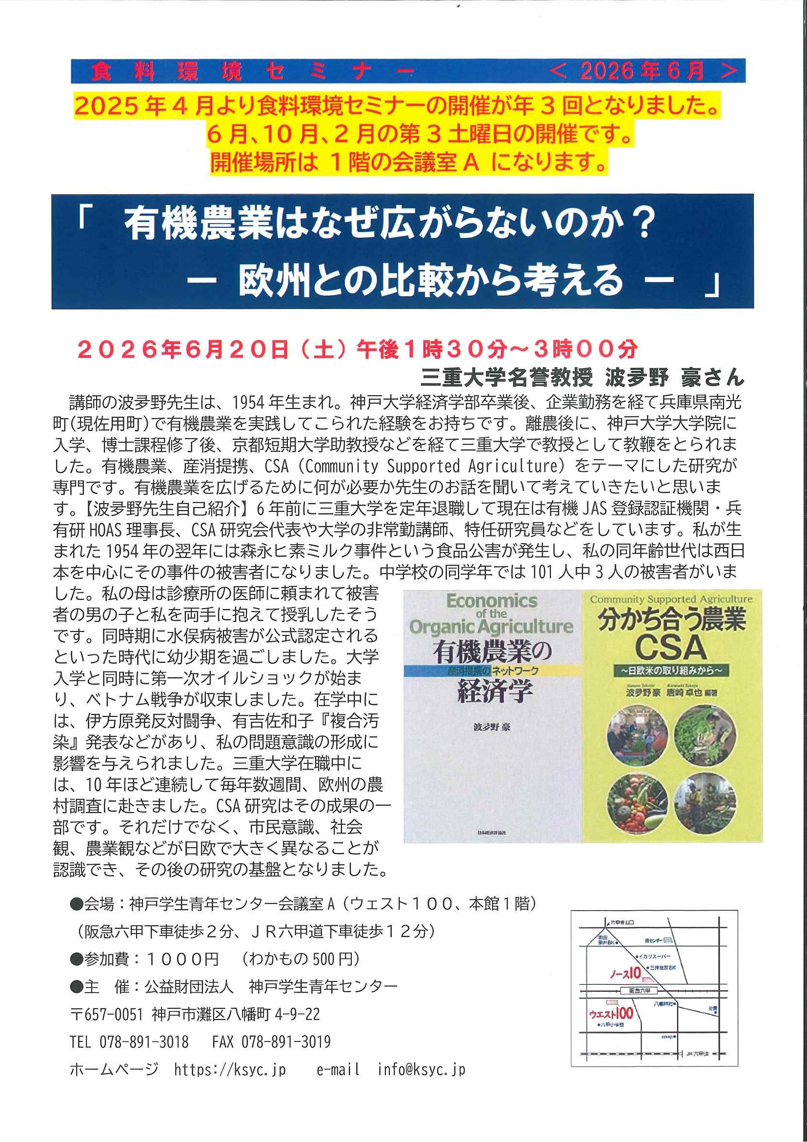講師の波夛野先生は、1954年生まれ。神戸大学経済学部卒業後、企業勤務を経て兵庫県南光町(現佐用町)で有機農業を実践してこられた経験をお持ちです。離農後に、神戸大学大学院に入学、博士課程修了後、京都短期大学助教授などを経て三重大学で教授として教鞭をとられました。有機農業、産消提携、CSA(Community Supported Agriculture)をテーマにした研究が専門です。有機農業を広げるために何が必要か先生のお話を聞いて考えていきたいと思います。【波夛野先生自己紹介】6年前に三重大学を定年退職して現在は有機JAS登録認証機関・兵有研HOAS理事長、CSA研究会代表や大学の非常勤講師、特任研究員などをしています。私が生まれた1954年の翌年には森永ヒ素ミルク事件という食品公害が発生し、私の同年齢世代は西日本を中心にその事件の被害者になりました。中学校の同学年では101人中3人の被害者がいました。私の母は診療所の医師に頼まれて被害者の男の子と私を両手に抱えて授乳したそうです。同時期に水俣病被害が公式認定されるといった時代に幼少期を過ごしました。大学入学と同時に第一次オイルショックが始まり、ベトナム戦争が収束しました。在学中には、伊方原発反対闘争、有吉佐和子『複合汚染』発表などがあり、私の問題意識の形成に影響を与えられました。三重大学在職中には、10年ほど連続して毎年数週間、欧州の農村調査に赴きました。CSA研究はその成果の一部です。それだけでなく、市民意識、社会観、農業観などが日欧で大きく異なることが認識でき、その後の研究の基盤となりました。