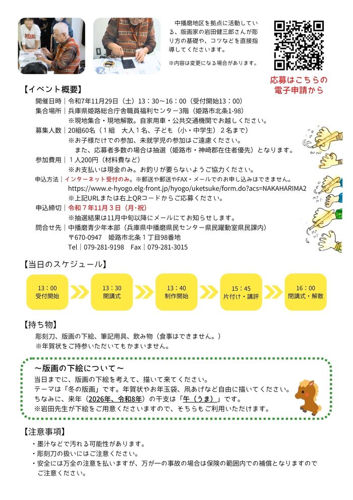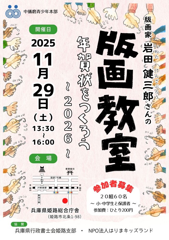 中播磨青少年本部では、行政や民間との協働により多様な青少年健全育成活動を推進しています。姫路を代表する版画家 岩田健三郎氏を講師に、版画の年賀状作成を行い、子どもたちの創造性、表現力を育みます。