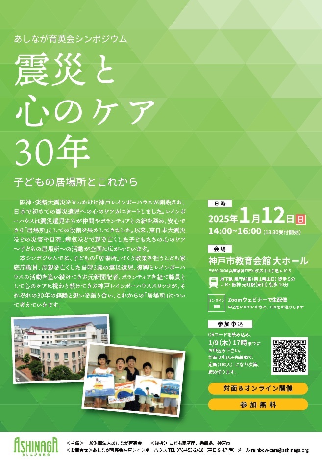 あしなが育英会は2025年1月12日(日)に、シンポジウム「震災と心のケア30年~子どもの居場所とこれから~」を兵庫県神戸市で開催します。