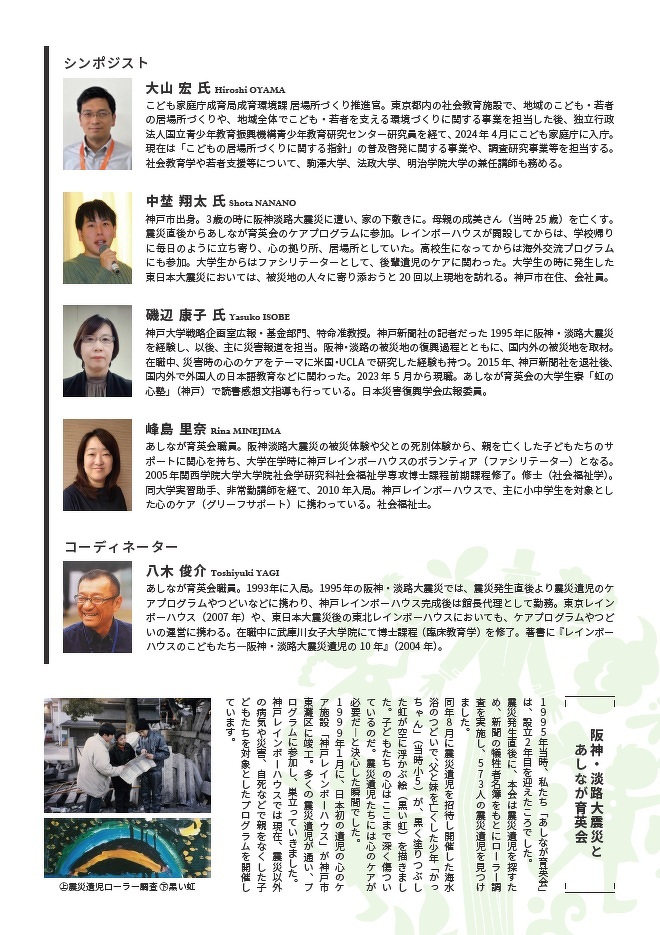 本シンポジウムでは、子どもの「居場所」づくり政策を担うこども家庭庁職員、母親を亡くした当時3歳の震災遺児、復興とレインボーハウスの活動を追い続けてきた元新聞記者、ボランティアを経て職員として心のケアに携わり続けてきた神戸レインボーハウススタッフが、それぞれの30年の経験と想いを語り合い、これからの「居場所」について考えていきます。