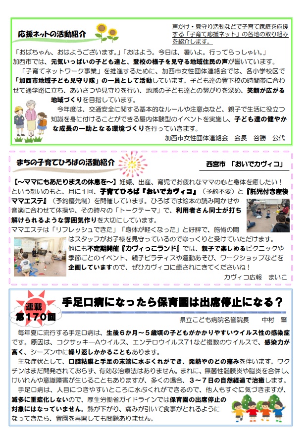 兵庫県の子育て支援事業の紹介や、子育て応援ネット・まちの子育てひろばの活動の様子、こどもの健康コラムなどを掲載した「地域子育てネットワークだより」を偶数月に発行しています。