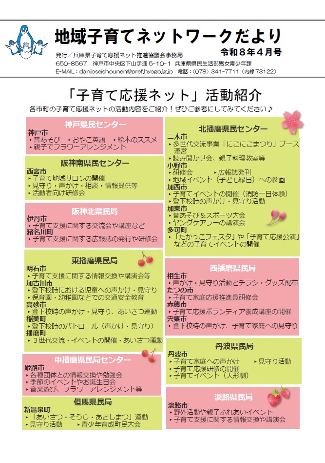 兵庫県の子育て支援事業の紹介や、子育て応援ネット・まちの子育てひろばの活動の様子、こどもの健康コラムなどを掲載した「地域子育てネットワークだより」を偶数月に発行しています。