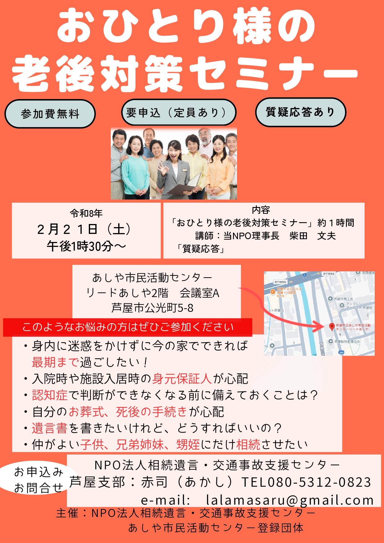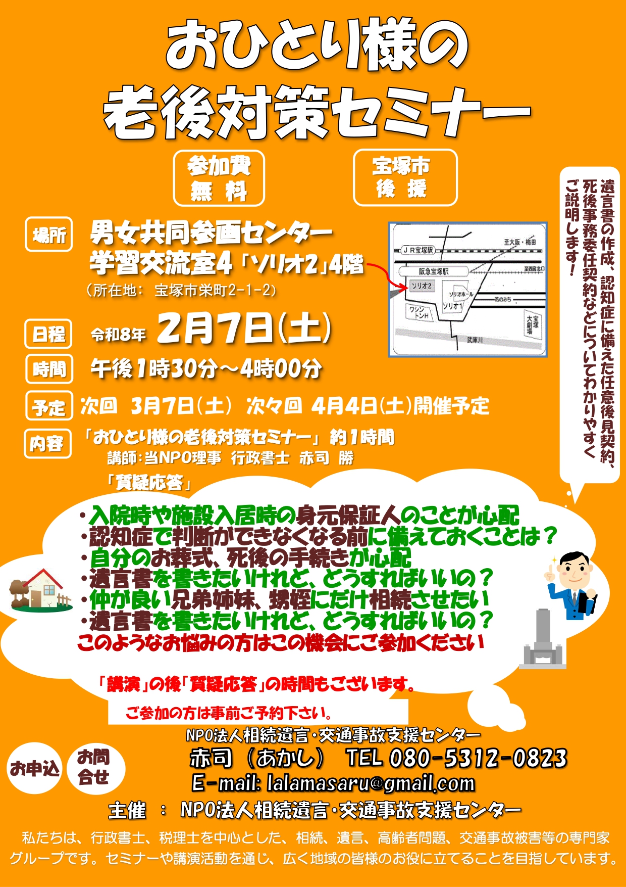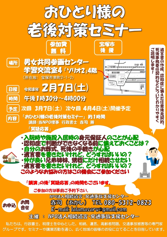 内容:おひとり様の老後対策セミナー 講演約1時間 講師:当NPO理事 行政書士 赤司 勝