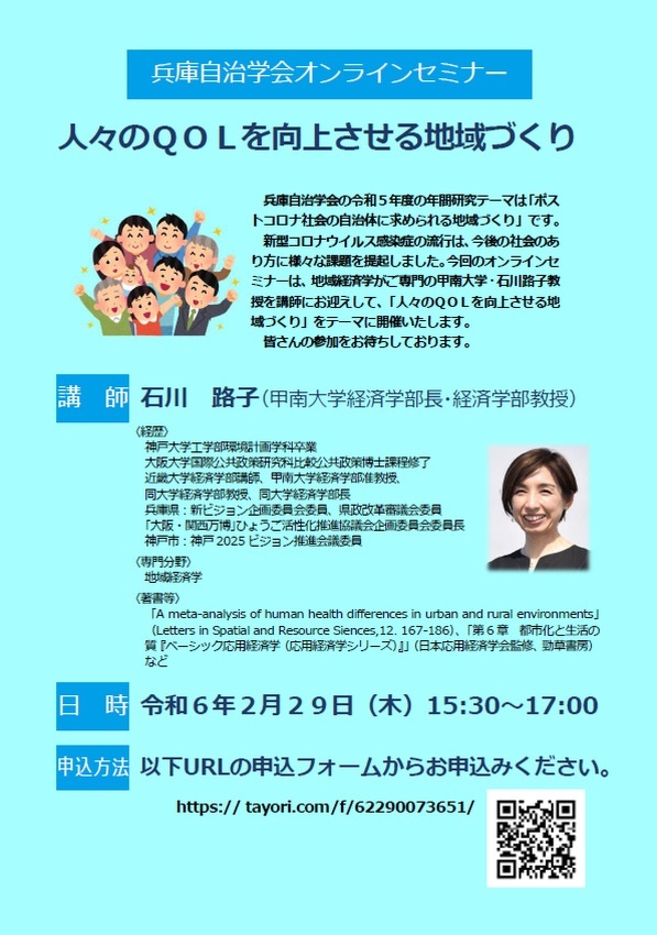 兵庫自治学会の令和5年度の年間研究テーマは「ポストコロナ社会の自治体に求められる地域づくり」です。新型コロナウイルス感染症の流行は、今後の社会のあり方に様々な課題を提起しました。今回のオンラインセミナーは、地域経済学がご専門の甲南大学・石川路子教授を講師にお迎えして、「人々のQOLを向上させる地域づくり」をテーマに開催いたします。