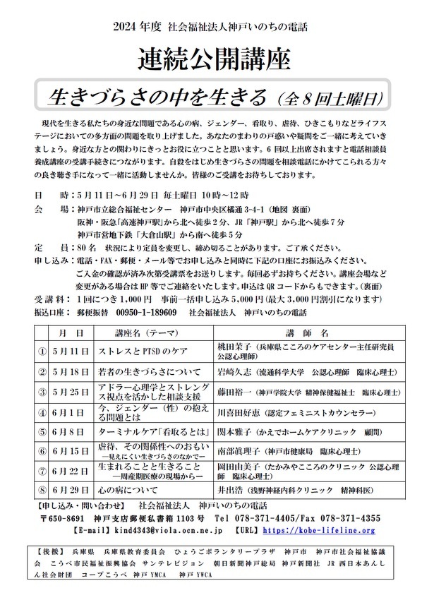 ▶詳細は、神戸いのちの電話HP「相談員の募集・連続公開講座」をご覧ください。