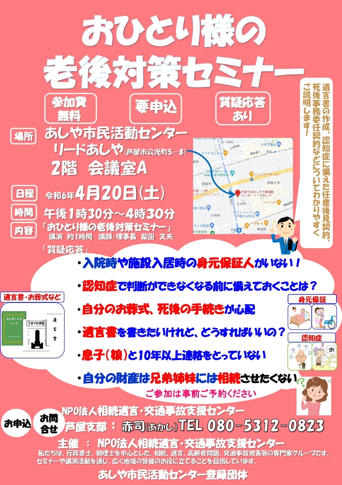 会場:あしや市民活動センター(リードあしや)2階 会議室A 日時:令和6年4月20日(土)13:30~16:30 内容:講演 理事長 柴田文夫 質疑応答 お申込みお問合せ:TEL 080-5312-0823 赤司(あかし)