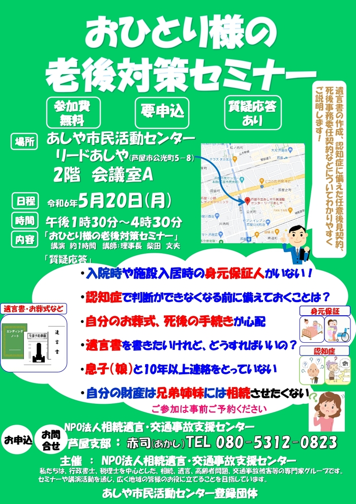 会場:リードあしや 日時:5月20日(月)13:30~16:30 内容:「おひとり様の老後対策」 講師:理事長 柴田文夫 「質疑応答」 お問合せ:TEL 080-5312-0823 赤司(あかし)