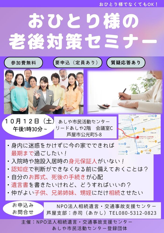 会場:リードあしや会議室C 日時:10月12日(土)13時30分~16時30分 内容:「おひとり様老後対策セミナー」講演 理事長 柴田文夫 お問合せ:赤司(あかし)TEL 080-5312-0823