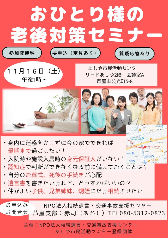 会場: リードあしや会議室A 日時: 11月16日(土)13:00~ 内容: 「おひとり様老後対策セミナー」講演 理事長 柴田 文夫 「質疑応答」 お問合せ: TEL 080-5312-0823 赤司(あかし)
