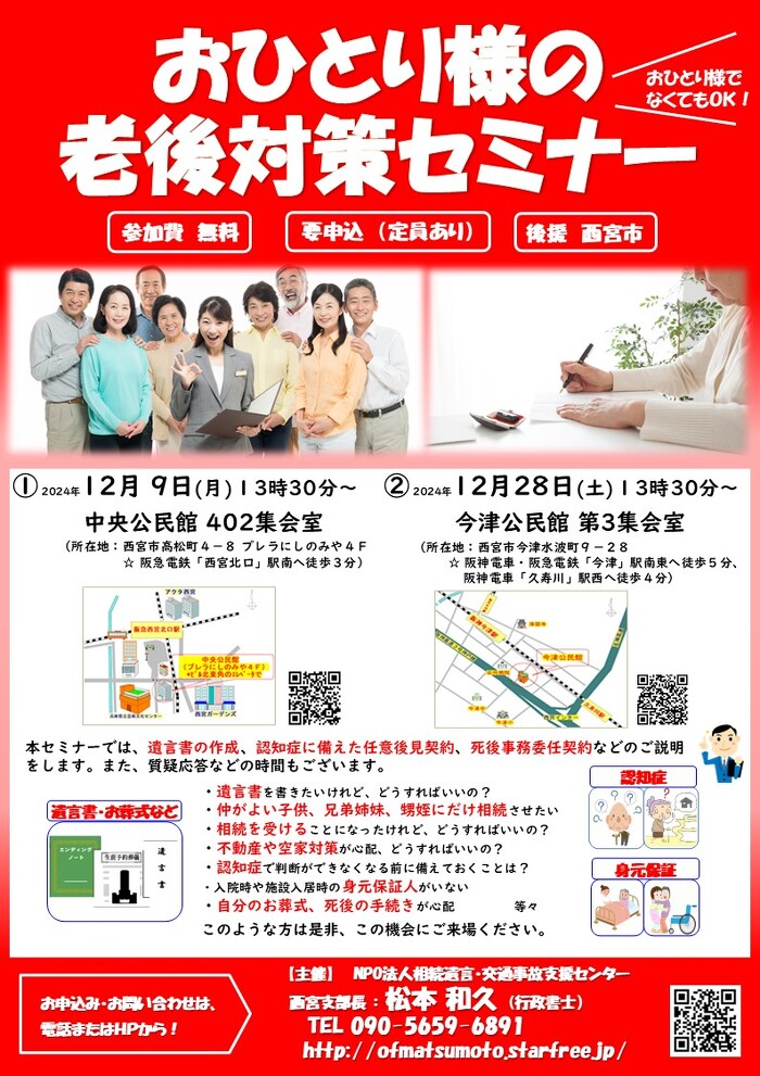 12/9・28 おひとり様の老後対策セミナー(西宮市)