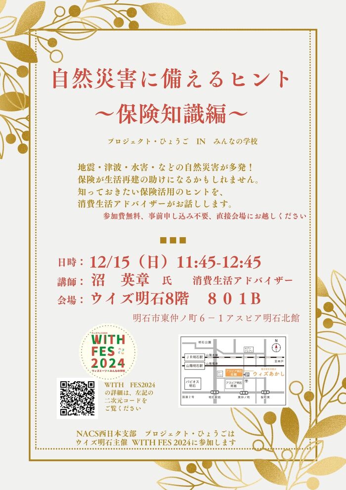 プロジェクト・ひょうごは、ウイズ明石が主催する「WITH FES2024 みんなの学校」にて上記の講座を開催します。明石市をはじめとする一般市民を対象に、災害時の保険についてプロジェクト・ひょうごメンバーがお話しします。