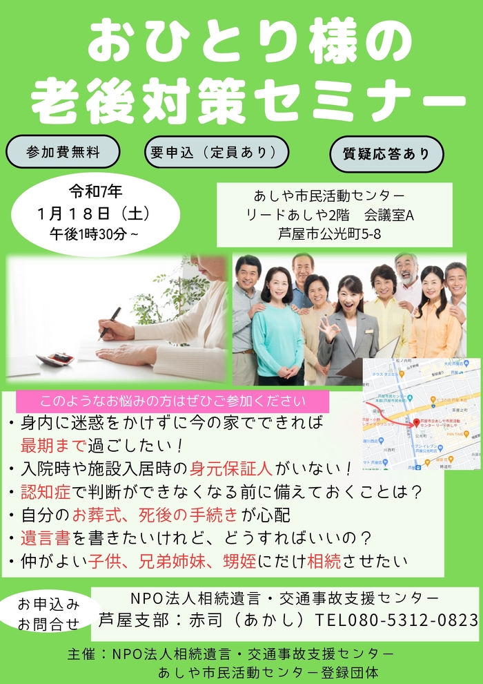会場:あしや市民活動センター(リードあしや)会議室A 芦屋市公光町5-8 日時:令和7年1月18日(土)13:30より 内容:おひとり様の老後対策セミナー 講演約1時間、質疑応答 お申込み: 赤司(あかし)TEL 080-5312-0823