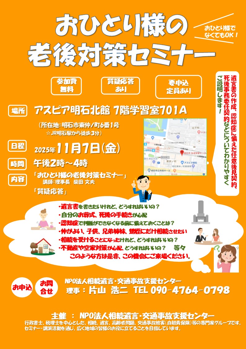 ◇日 時 令和7年11月7日(金)PM2:00~ ◇内 容 「おひとり様の老後対策セミナー」 講師:理事長 柴田 文夫 「無料質疑応答」 ◇お申込み・お問い合わせ 柴田 文夫 080-3100-0809 ホームぺージからもどうぞ