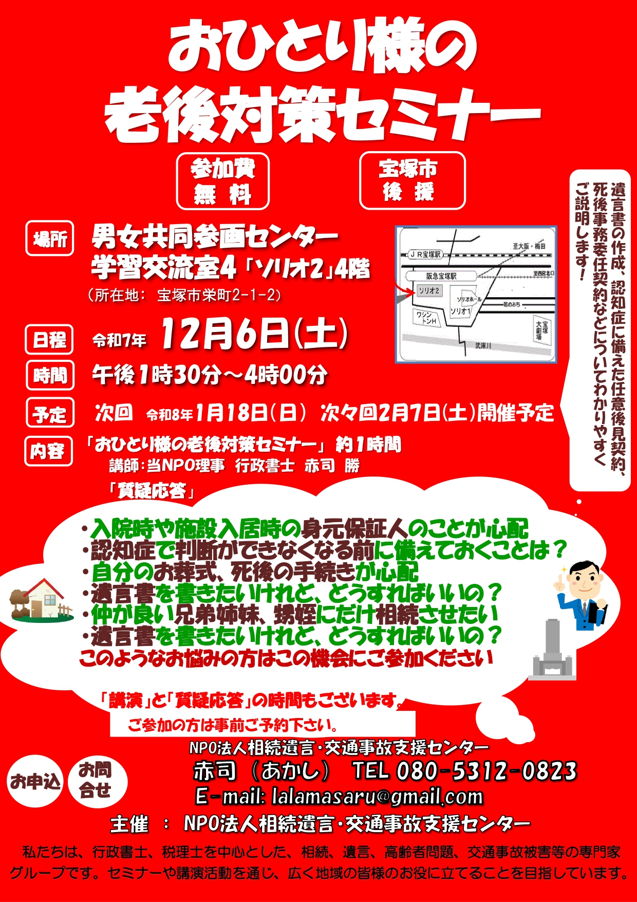 会場:男女共同参画センター学習交流室「ソリオ2」4階 宝塚市栄町2-1-2 日時:令和7年12月6日(土)13:30より 内容:おひとり様の老後対策セミナー 講演約1時間 講師:当NPO理事 行政書士 赤司 勝 質疑応答 お申込み: 赤司(あかし)TEL 080-5312-0823